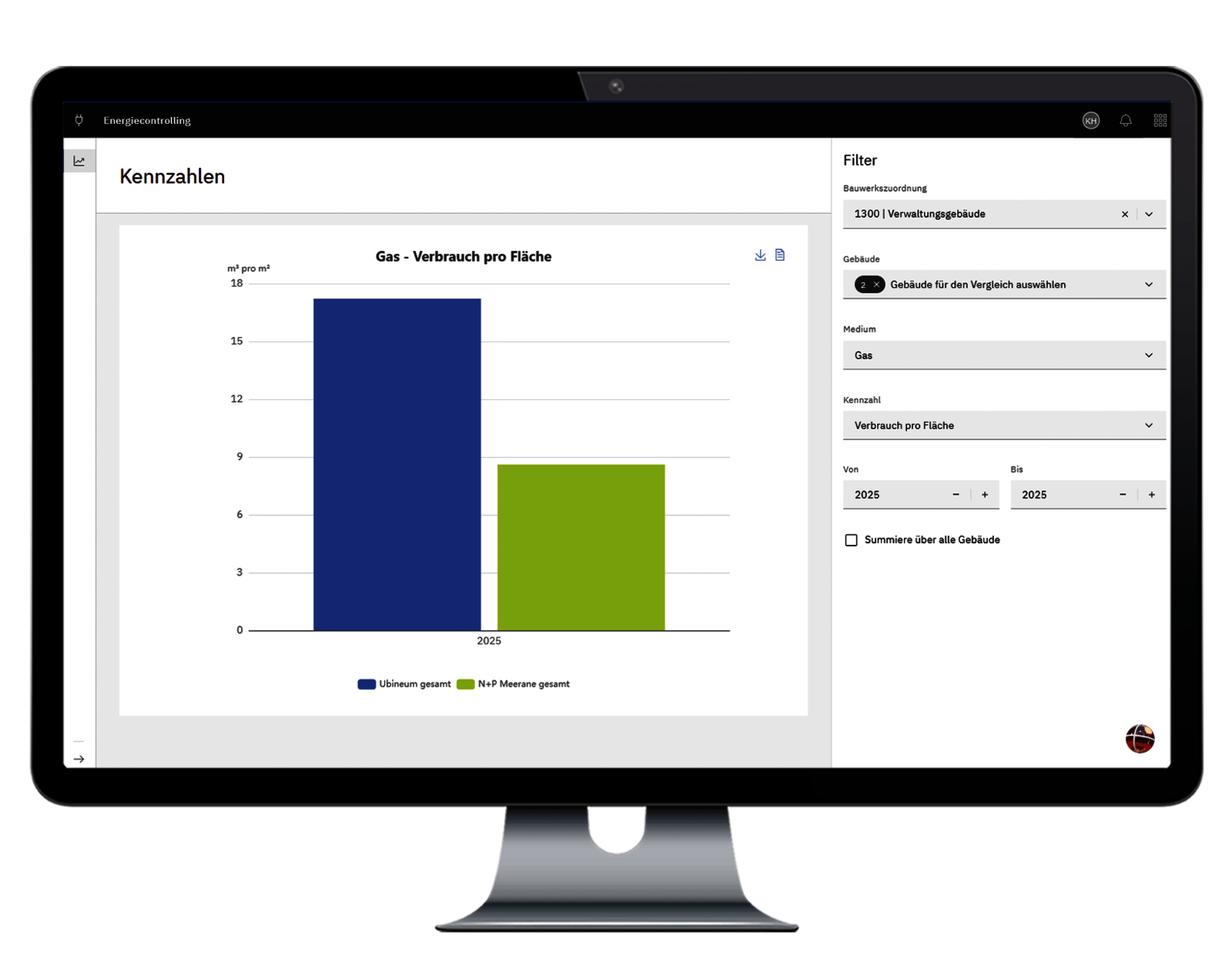 Monitor mit Balkendiagramm, das den Gasverbrauch pro Fläche zweier Gebäude im Energiecontrolling vergleicht.