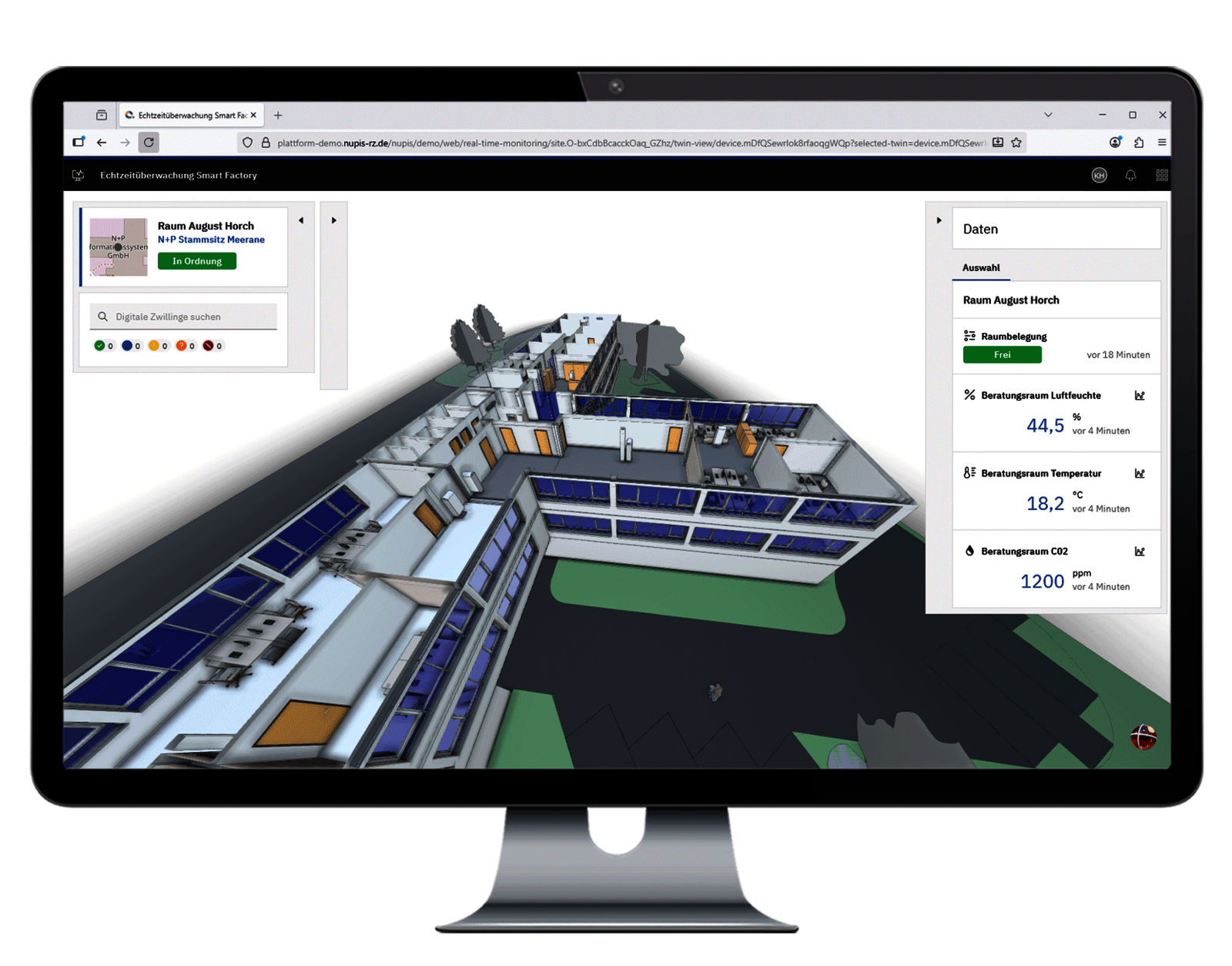 Monitor mit 3D-Gebäudemodell und Echtzeitdaten zu Belegung, Temperatur, Luftfeuchte und CO₂ in einem ausgewählten Raum.
