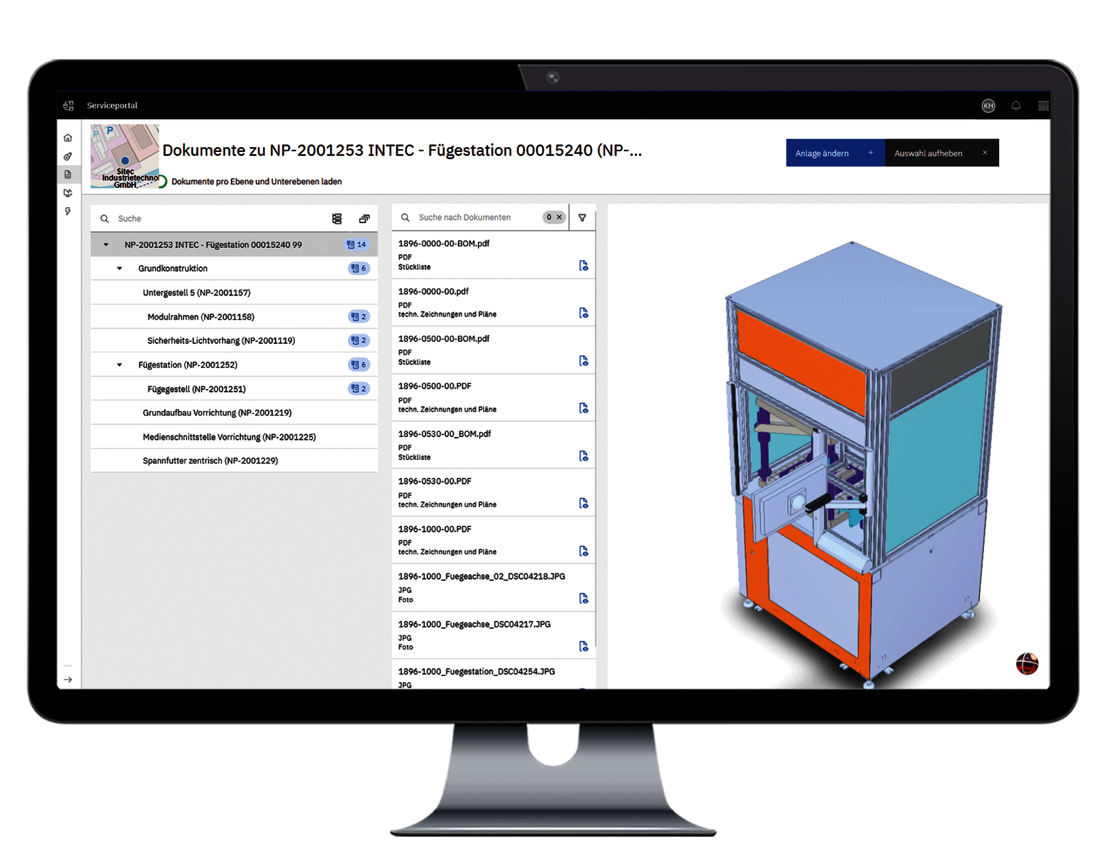 Monitor mit Dokumentenliste und 3D-Modell einer Anlage als Digitaler Zwilling im Serviceportal.