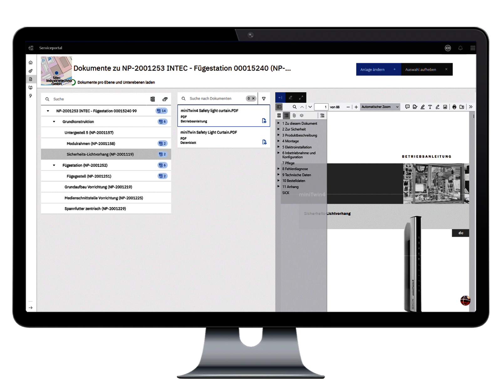 Monitor mit Dokumentenverwaltung im Serviceportal mit Baugruppenstruktur, Dokumentenliste und PDF-Vorschau am Digitalen Zwilling.